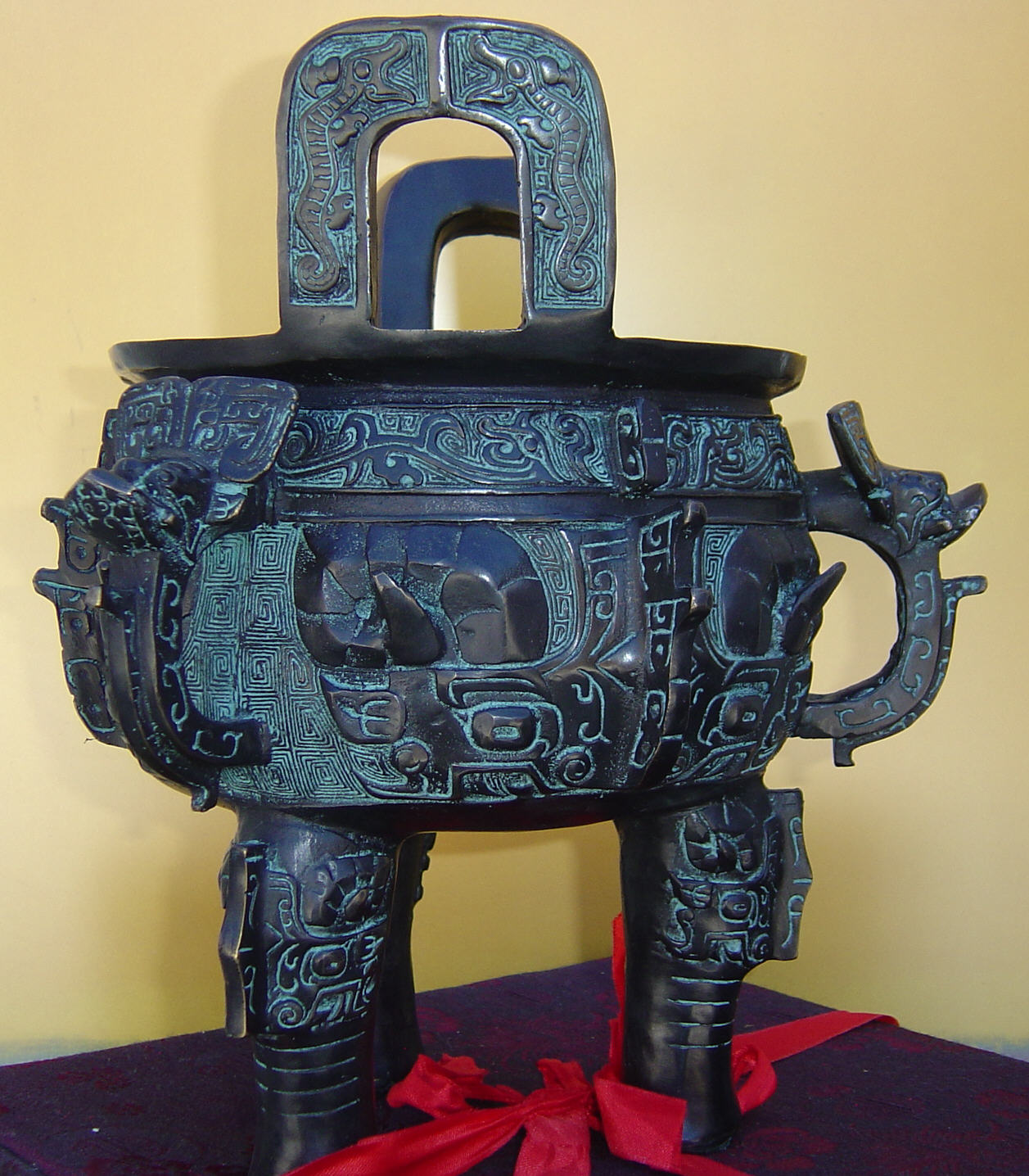 Our Bronze Small Incense Urn is called a " Small Ding" in Chinese. This is a replica of an urn that has been declared a "State Treasure" due to it's exquisite detailing and design. The original Urn is more than 3,000 years old, a 1,000 years older than the Terra Cotta Warriors! Our Urn measures 11" tall to the top of the handle, is 8" round and comes inside a beautiful cloth wrapped box.