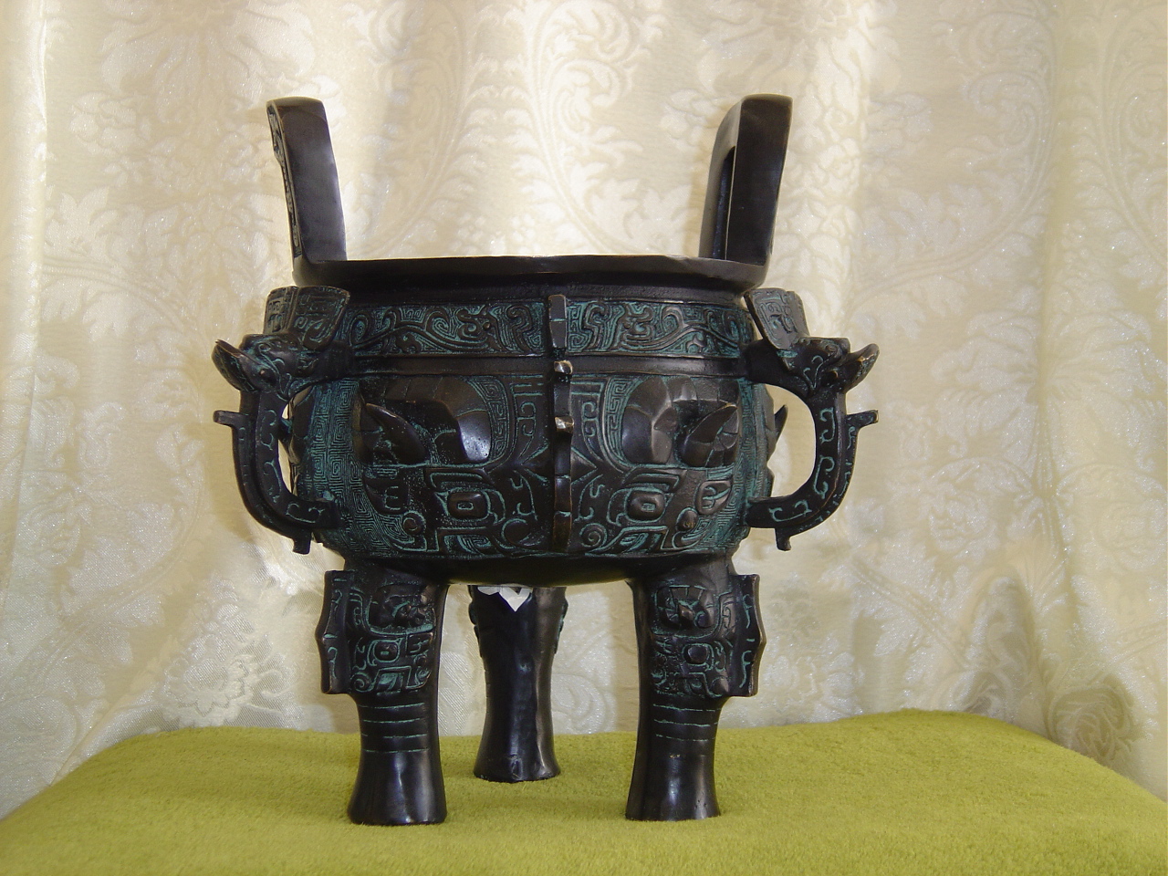 Our Bronze Large Incense Urn is a full size replica of the original urn that is a "State Treasure". The detailing on the Urn is rich and beautiful. The original Urn is more than 3,000 years old, a 1,000 years older than the Terra Cotta Warriors! The Large Urn measures 18" tall to the top of the handle, is 19" round. It comes with it's own wooden stand.